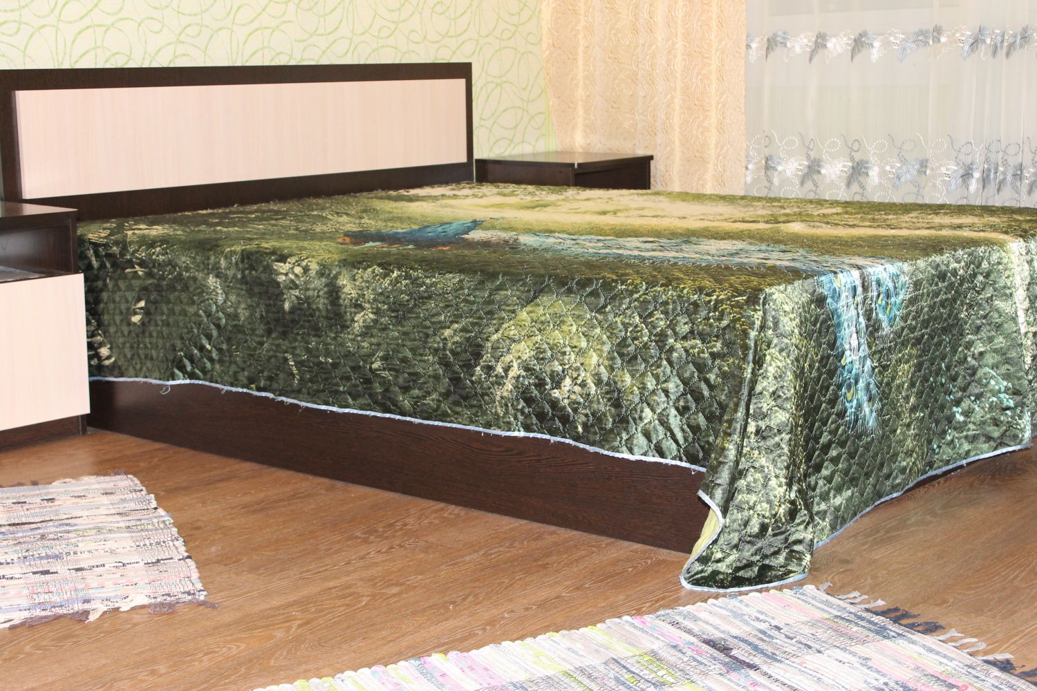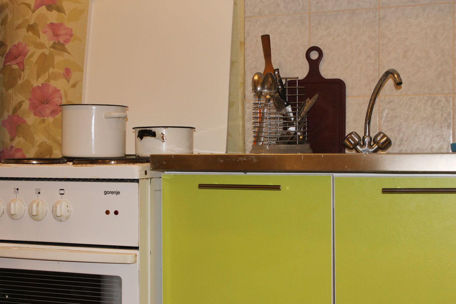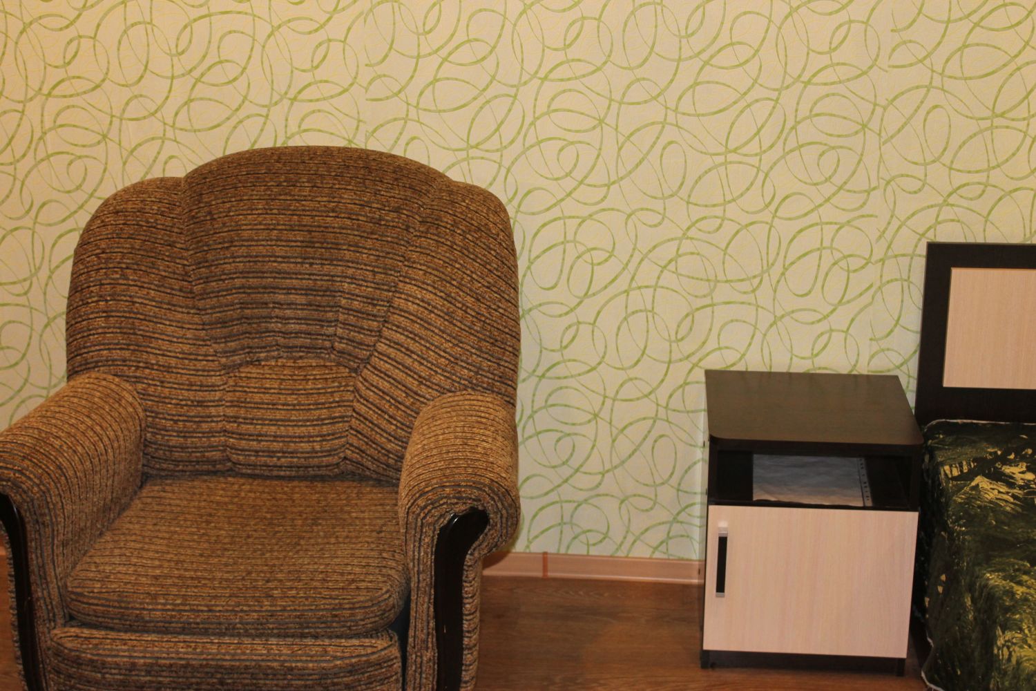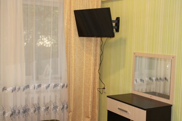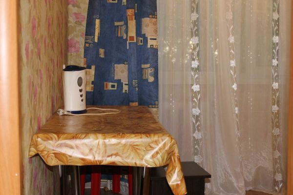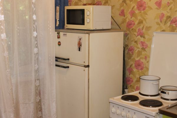Однокомнатная квартира в центре города. Дом панельный. Решетки на окнах и две входные двери. На стенах - обои, на полу - линолеум.